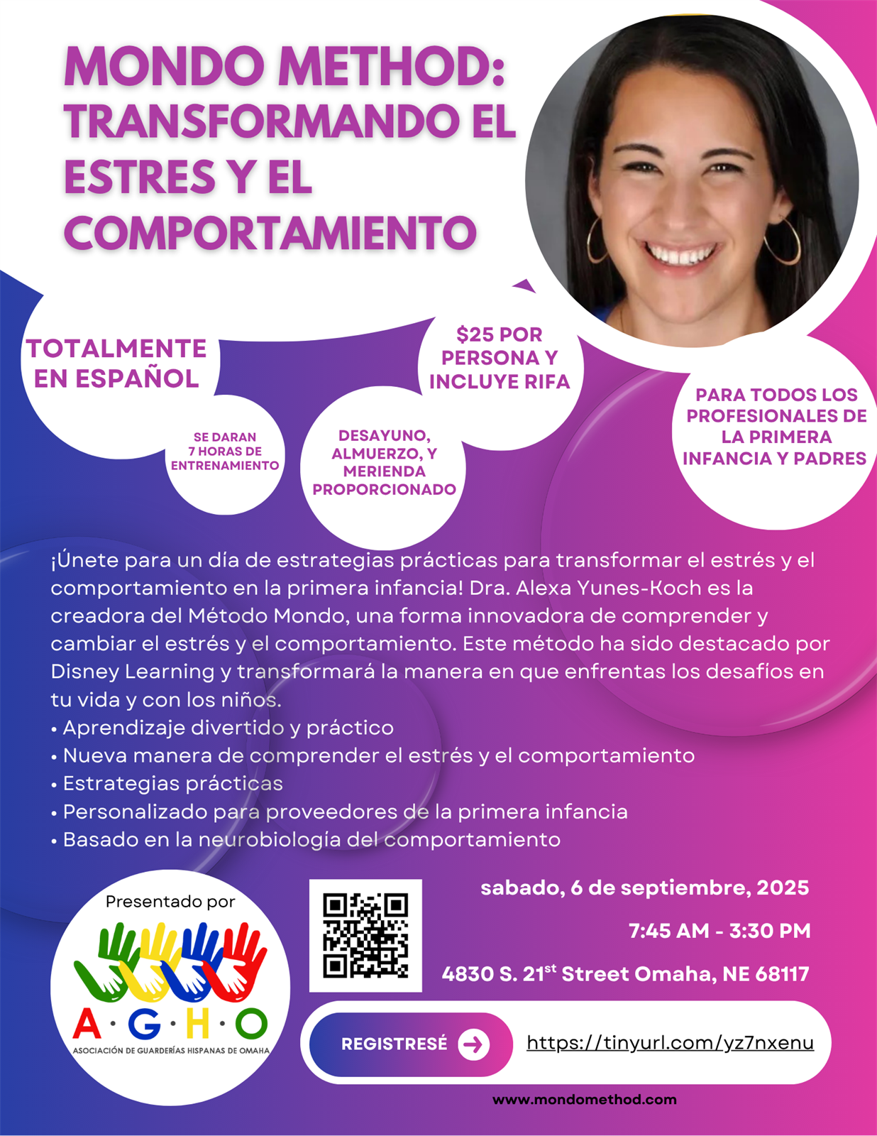 | Description | | ¡Únete para un día de estrategias prácticas para transformar el estrés y el comportamiento en la primera infancia! Dra. Alexa Yunes-Koch es la creadora del Método Mondo, una forma innovadora de comprender y cambiar el estrés y el comportamiento. Este método ha sido destacado por Disney Learning y transformará la manera en que enfrentas los desafíos en tu vida y con los niños. |