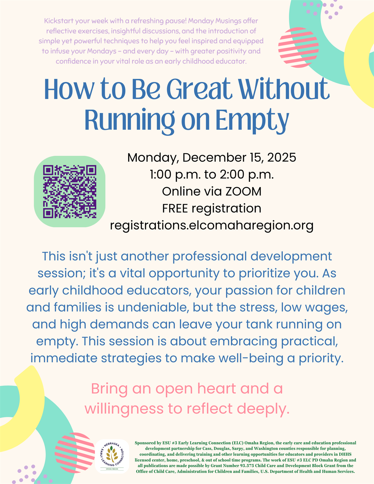| | 24437 | Monday Musings: How to Be Great Without Running on Empty | 12/15/2025 1:00:00 PM | | ESU#3 Early Learning Connection | Haggart | System.Collections.Generic.List`1[odie.workshops.Facilitator] | | 0.00 |  | odie.workshops.Section |